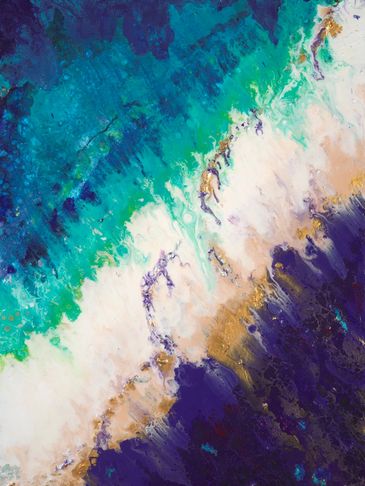 Ocean Burst - is a birds eye view of the beach with an explosion of purple and gold flowing through it. The purple river connects the colors, as the gold thread holds everything together. Life has highs and lows and how we react to these seasons matters. Everything is temporary, and this too will pass. Your next miracle is just around the purple and gold bend.